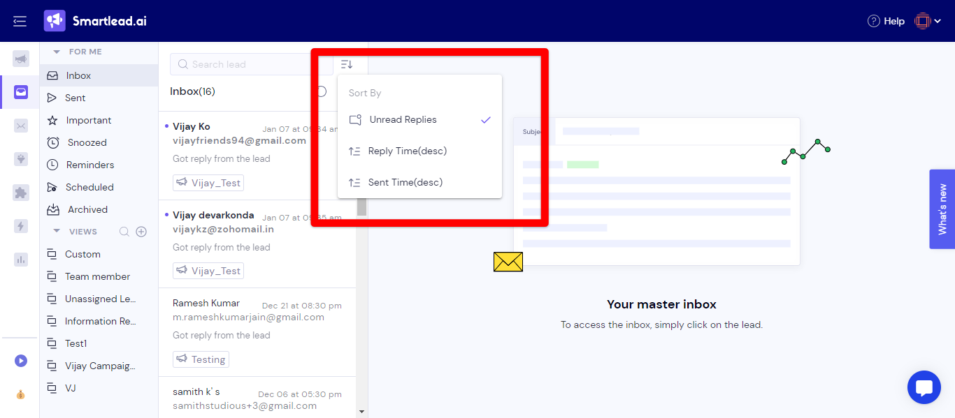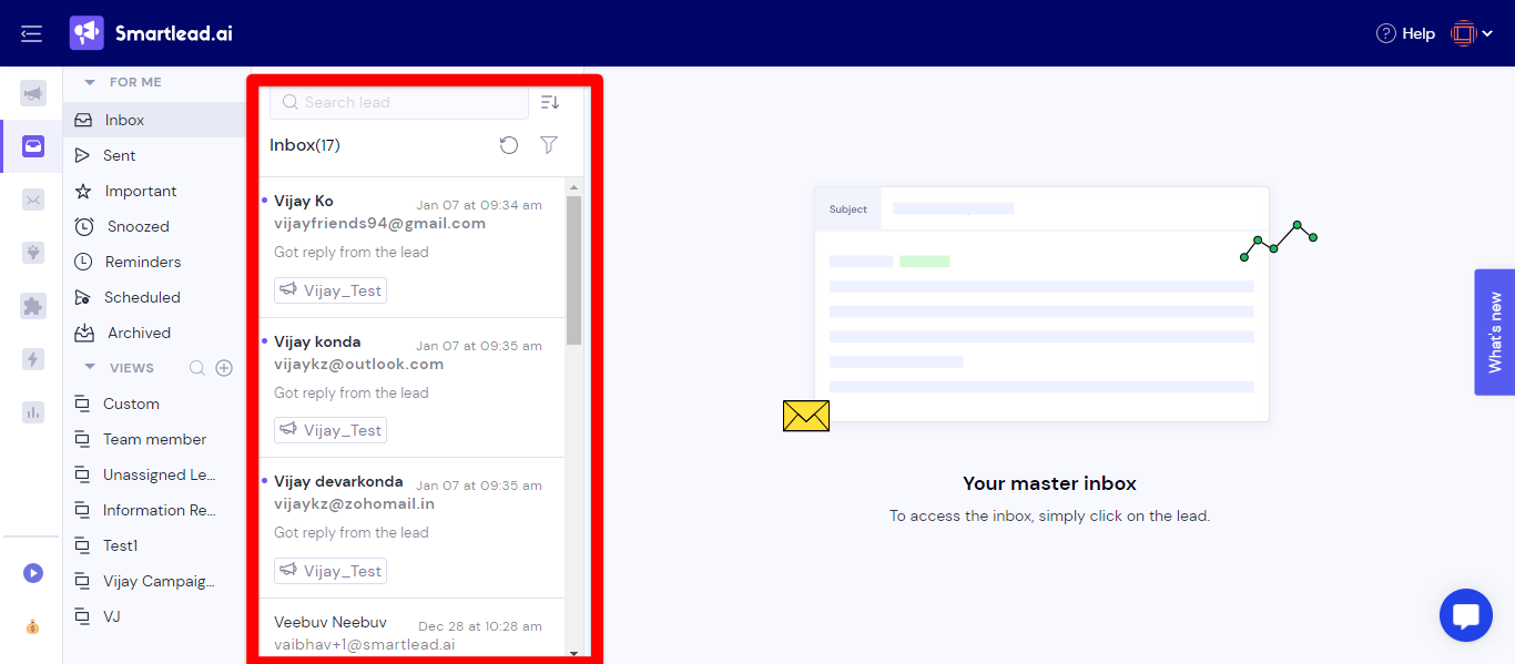 Instant Email replies in Master Inbox enable you to view incoming emails from leads the moment they respond.