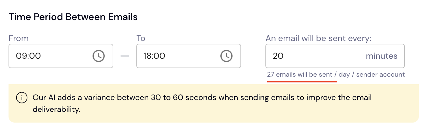 Ensure that your schedule is set as desired. When setting the Start-To time periods and selecting the "An email will be sent every" option, make sure the number that shows up at the bottom of the input field matches your expectation of the number of emails to be sent out per mailbox connected to your Smartlead campaign.